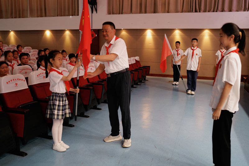 队旗飘飘 代代相传 林校长为一年级新中队授旗,为新聘辅导员颁发聘书。
