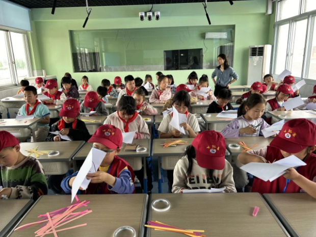 竹编是一项具有悠久历史的中国非物质文化遗产,是中国民间手工艺的重要组成部分。为弘扬中华传统文化,让学生体验非遗文化的魅力,6月3日中午,《常州晚报》小记者协会在孟河中心小学录播教室组织小记者们开展了“青青傲骨竹 化为绕指柔”竹编体验活动。 竹编画有着悠久的历史,是一种传统的手工艺品。它以竹子为主要材料,需要通过精细的编织和设计,创作出各种具有艺术价值的作品。活动开始,老师向大家详细讲解了竹编的历史、竹制品、常见的竹编样式和传承意义,现场氛围在一个个活泼的问答中浓烈起来。 竹编艺术如歌如诗,在对竹编有了一定了解后,小记者们在老师的带领下,以彩色纸条代替竹条,开始竹编画的制作体验。一双双巧手剪下纸上的蝴蝶,将纸条按颜色分为三类,仔仔细细地粘贴了一排,照着老师制作的步骤有模有样地编织着。一个个散乱的纸条在手指一抬一压间上下穿插,纵横交错中,创作出了一幅幅蝴蝶竹编画。