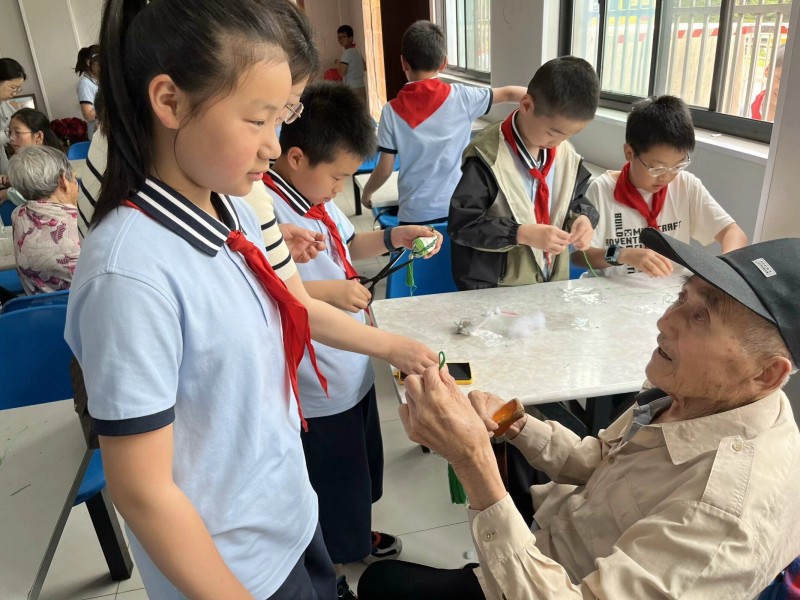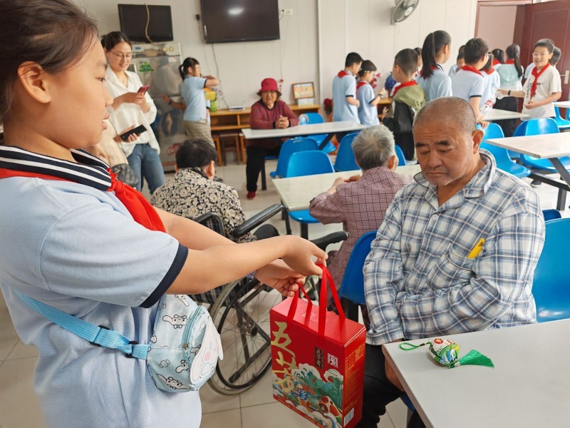 队员们不仅学到了手艺,还了解到香囊在端午节期间的特殊意义,它不仅是一种装饰品,更是一种寄托着人们美好愿望和祝福的象征,感受到了传统文化的魅力。 不仅如此,队员们还送给老人们送上了端午节粽子等礼品,老人们接过礼品,感受着孩子们的心意,仿佛又回到了年轻时与亲人共度端午的温馨时光。