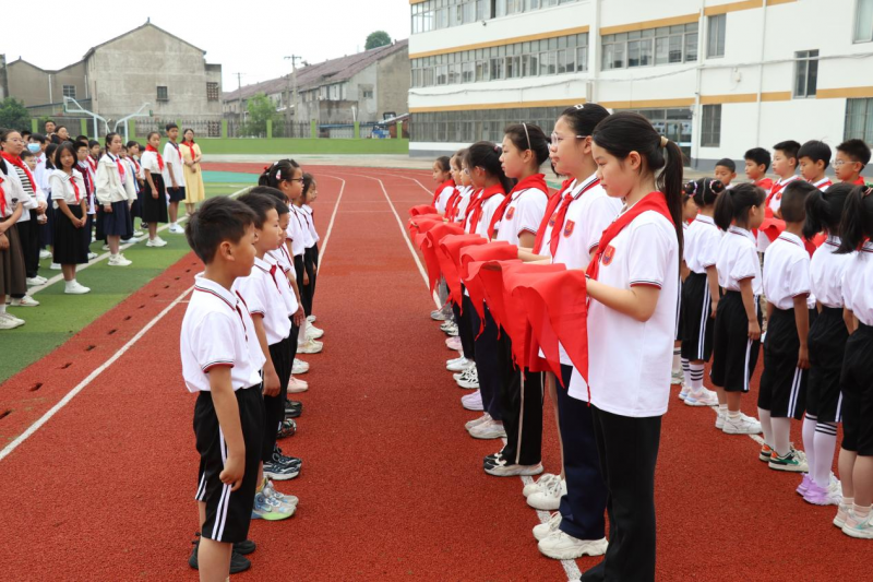 三、荣耀启程迎队员 鲜艳的队旗随风飘扬,队员们的小脸神采奕奕。伴随着激昂的《出旗曲》,孝都小学一年级新队员入队仪式拉开了序幕,旗手们精神饱满,全体师生共同唱响《我们是共产主义接班人》。 大队辅导员周珠艳老师宣布一年级新队员入队名单,一年级共有24位学生加入中国少年先锋队,成为光荣的中国少年先锋队队员。在欢快的音乐声中,四(2)中队的队员们授予一年级新队员少先队的标志——红领巾。新老队员之间的互动,是一种荣耀的传递,也是一份责任的嘱托。面向大队旗,孝都小学全体队员庄严宣誓,右手握、举在耳侧。响亮的誓词是新时代少先队员们向世界发出的最强音。孝都小学少工委主任徐文娟校长为一年级两个中队授中队旗并为李净老师、丁露老师颁发辅导员聘书。 孝都小学党支部书记匡龙兴向新队员们提出希望和要求,期望他们爱祖国、爱集体、爱学习、爱劳动,做全面发展的好队员;希望他们永争向上,为红领巾增光添彩;希望他们勇于实践,敢于创新,让少先队组织充满生机和活力。