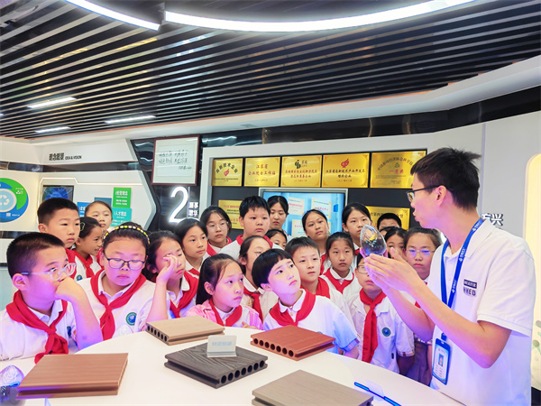 队员们先跟随着公司研发部吴丹硕士参观了常州厚德的科技展厅。吴叔叔向队员们详细讲解了废旧小家电的拆解、战略金属的绿色再生、退役动力电池的资源化利用过程等内容,队员们的眼睛里充满了惊喜和好奇,原来生活中的垃圾是这样“变废为宝”的。