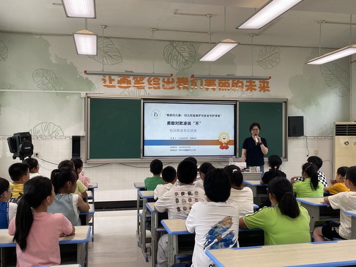 保护未成年人就是保护国家的未来、民族的希望。为进一步提升青少年对未成年人保护法的了解,呵护青少年健康成长,西夏墅中心小学联合华墅社区妇联于6月14日开展了主题为“勇敢对欺凌说‘不’”校园欺凌普法讲座。活动邀请了北京大成律师事务所的许靓律师为队员们普法。
