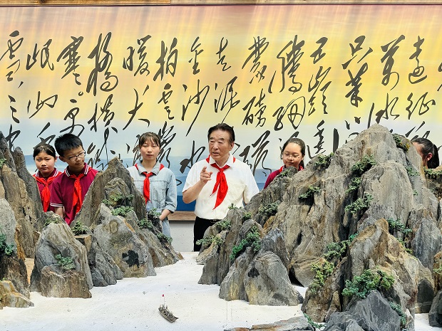 队员们在魏爷爷的带领下走进工作室。聆听着魏爷爷生动的介绍,队员们对眼前的盆景作品产生了浓厚的兴趣。循着石阶往工作室深处走,一件大型斧劈石盆景作品呈现在队员们面前。听了辅导员胡老师的介绍,大家了解到这件作品叫做“长征”。魏爷爷绘声绘色地给大家讲述着他创作的初衷和感悟,让队员们沉浸其中,对长征精神有了更深入的理解。